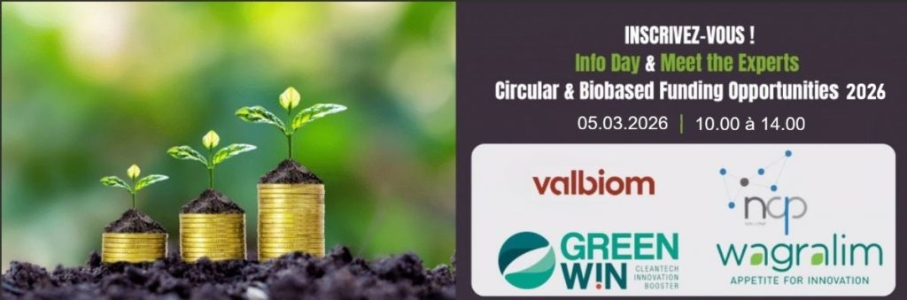 Le NCP Wallonie, GreenWin, Valbiom et Wagralim organisent une demi-journée d’information pour les entreprises actives dans le secteur de (ou en transition vers) la bioéconomie et l’économie circulaire. La première partie vous présentera les opportunités qui s’offrent à vous en 2026, la deuxième vous permettra de rencontrer, sur rendez-vous préfixé uniquement, nos experts !
